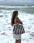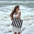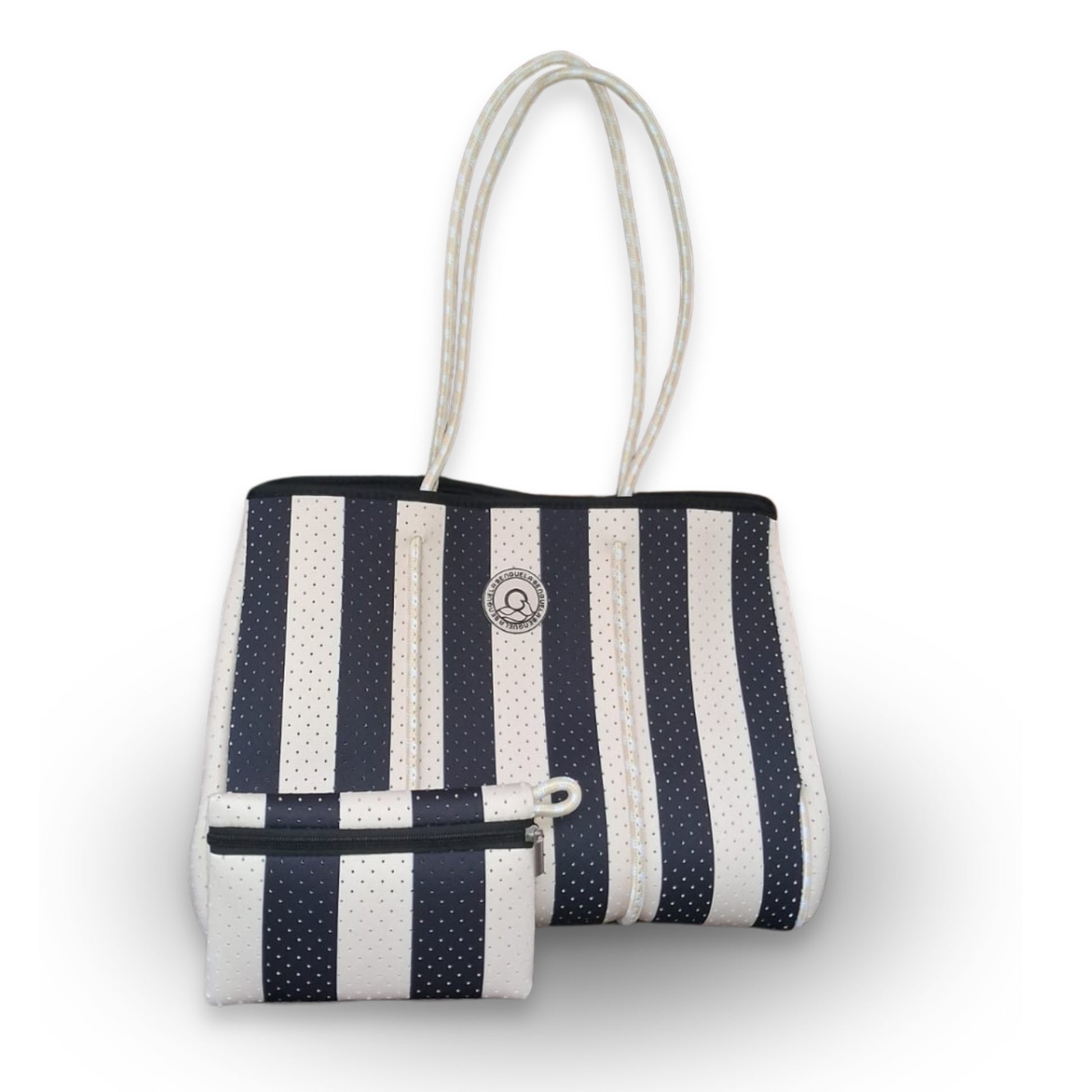 Make a stylish splash with our Nautical striped neoprene beach tote! Crafted from lightweight, water-resistant neoprene with signature perforated detailing, this roomy tote is perfect for beach days, weekend getaways, or everyday errands.